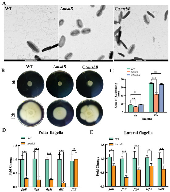 (A) Visualization of bacterial flagellar with negative-staining electron microscopy. Scale bar = 1 μm; (B) swimming motility assay of WT, ∆msbB, and C∆msbB on LB plates with 0.3% agar cultured for 6 h and 12 h at 37 °C; (C) analysis of motility ability of WT, ∆msbB, and C∆msbB strains. The diameters of swimming zone reflect bacterial migration on the 0.3% agar. Statistical comparisons were performed using two-way ANOVA analyses followed by a Dunnett’s multiple comparison test; (D) qRT-PCR analysis of the transcription levels of polar flagellar genes (flgB, flgK, flgM, fliC, and fliE) in ∆msbB compared to WT. *** p < 0.001; and (E) qRT-PCR analysis of the transcription levels of lateral flagellar genes (fliK, fliR, flgB, lafA, and motY) in ∆msbB compared to WT. Statistical comparisons were performed using two-way ANOVA analyses followed by a Dunnett’s multiple comparison test; The data are presented as the mean ± SD (n = 3). * p < 0.05; ** p < 0.01; and *** p < 0.001. ns: not significant.
