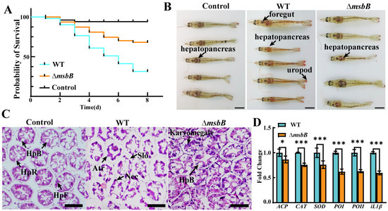 Assessment of ∆msbB and WT strains’ pathogenicity against shrimp. (A) Relative survival curve of shrimp infected by ∆msbB and WT strains with immersion in concentration 4 × 107 CFU/mL; (B) clinical sign of diseased shrimps during infection at 10 d. The arrows indicate hepatopancreas, foregut, and uropod. Scale bar: 1 cm; (C) hepatopancreas of shrimp challenged with ∆msbB and WT strains at 7 d stained with H&E. HpB, B cells; HpF, F cell; HpE, E cell; HpR, R cell; karyomegaly, enlargement of nucleus; Nec, necrosis; Atr, atrophy; Slo, sloughing of epithelial cells. Scale bar: 100 μm; and (D) comparative analysis of the expression of immune-related genes and inflammatory cytokine interleukin-1β (IL-1β) gene in hepatopancreas of shrimp infected with ∆msbB strain vs. WT group. Statistical comparisons were performed using two-way ANOVA analyses followed by a Dunnett’s multiple comparison test; Columns have been marked with an asterisk (* p < 0.05; *** p < 0.001).