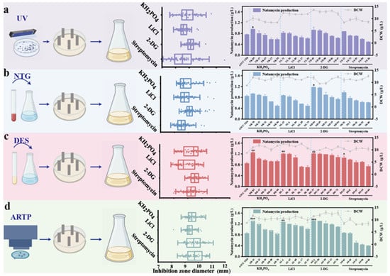 Different strategies for screening natamycin high-producing mutants. (a) Strategies based on UV mutagenesis; (b) strategies based on NTG mutagenesis; (c) strategies based on DES mutagenesis; and (d) strategies based on ARTP mutagenesis. In each method, the strains were mutagenized and then coated onto plates containing varying concentrations of streptomycin, 2-DG, KH2PO4, and LiCl. The plates were then incubated at 28 °C for 8 d. Natamycin production and dry cell weight (DCW) of mutants were measured after 96 h of shake flask fermentation. Each fermentation experiment was performed in triplicate, and the results were expressed as the mean of three independent replicates, with error bars representing the standard deviation. * indicates significance at p < 0.05, ** indicates significance at p < 0.01, and *** indicates significance at p < 0.001.
