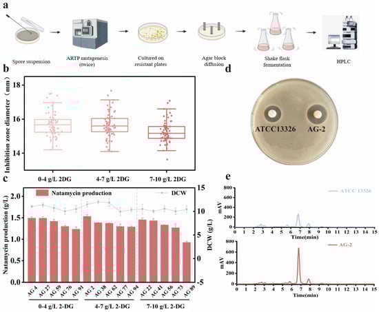 Screening for natamycin-producing strains using ARTP mutagenesis combined with 2-DG. (a) Workflow of ARTP mutagenesis combined with 2-DG tolerance screening; (b) agar diffusion method to assess the antimicrobial activity of the mutants; (c) natamycin production and dry cell weight (DCW) of the five highest-yielding mutants obtained on plates with different phosphate concentrations; (d) comparison of the inhibition zone diameter between S. gilvosporeus ATCC 13326 and S. gilvosporeus AG-2; and (e) HPLC analysis of natamycin production in S. gilvosporeus ATCC 13326 and S. gilvosporeus AG-2. Fermentation was repeated three times. Data are presented as the mean of three independent cultures, with error bars representing standard deviation.
