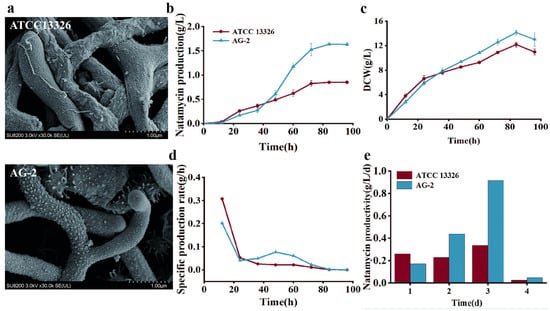 Physiological differences between S. gilvosporeus ATCC 13326 and S. gilvosporeus AG-2. (a) Mycelial morphology; (b) natamycin production; (c) dry cell weight (DCW); (d) specific production rate; and (e) productivity.