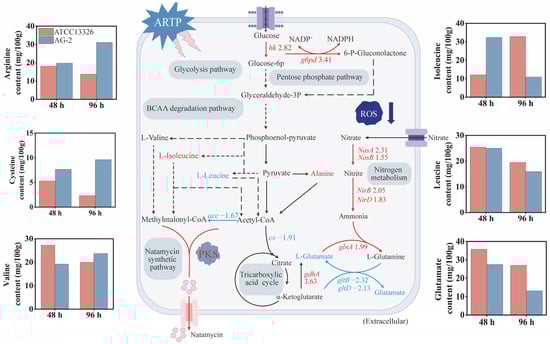 As shown in Figure 5, the intracellular levels of arginine and cysteine in AG-2 were consistently higher than those in the original strain at both 48 h and 96 h. During the early fermentation phase, the intracellular isoleucine level in AG-2 was 2.67 times that of the original strain, while the valine level was 29.4% lower. Valine supplementation experiments revealed that adding 0.50 g/L of valine at 24 h increased natamycin production by 8.43% (Figure S3). Additionally, the intracellular glutamate level in AG-2 was 23.4% lower than that in the original strain. Glutamate is primarily synthesized through two pathways: (1) the reductive amination of α-ketoglutarate by glutamate dehydrogenase (encoded by gdhA) and (2) the reaction of glutamine with α-ketoglutarate, catalyzed by glutamate synthase (GOGAT, encoded by gltB and gltD), with the consumption of NADPH to produce glutamate (Figure 5). To explore the cause of the reduced intracellular glutamate, we analyzed the transcriptional changes in key genes in these biosynthesis pathways. In AG-2, the transcriptional level of gdhA was upregulated by 3.63-fold, suggesting enhanced conversion of α-ketoglutarate to glutamate. Additionally, the transcription levels of genes involved in nitrogen assimilation, including nasB, nasA, nirB, nirD, and glnA, were upregulated, promoting the synthesis of glutamine and glutamate (Figure 5).