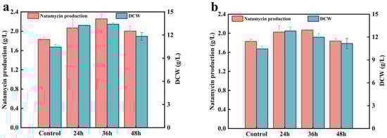 Effect of nitrogen metabolism on natamycin production by S. gilvosporeus AG2. (a) Exogenous addition of glutamate at 24, 36, and 48 h on natamycin production of AG-2; (b) exogenous addition of glutamine at 24, 36, and 48 h on natamycin production of AG-2. DCW: dry cell weight.