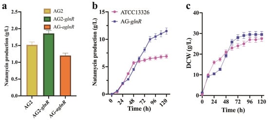 To assess the impact of GlnR on natamycin production, the glnR gene was first amplified from S. gilvosporeus ATCC13326. It was then inserted into the pIB139 vector under the control of the ermEp promoter to create the overexpression plasmid pIB139-glnR. This expression vector was subsequently introduced into S. gilvosporeus via conjugation, resulting in the engineered strain AG-glnR. Shake flask fermentation results showed that AG-glnR produced 1.85 g/L of natamycin after 96 h of fermentation, representing a 20.9% increase compared to AG-2 (Figure 7a). Subsequently, the AG-aglnR strain was also constructed, in which the translation of the glnR gene was inhibited using antisense RNA (Figure 7a). The natamycin production of AG-aglnR was 1.20 g/L, 20.52% lower than AG-2. These results suggest that GlnR positively regulates nitrogen metabolism, thereby enhancing natamycin synthesis in AG-2.