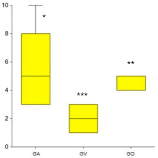 Number of UTIs one year after finishing the prophylaxis in GA, GV, and GO. * GA, one outlier case, ** GO: two outliers cases, *** GV: three outliers cases.
