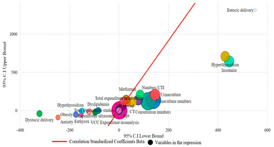 Negative correlations were observed between the total expenditure and factors such as obesity (p = 0.00020), anxiety (p = 0.00021), and dystocic delivery (p = 0.011) (Supplementary Table S1). Conversely, positive correlations were noted with variables including age (p = 0.001), ASA III scale (p = 0.001), and the number of UTIs (p = 0.00016). Expenditure increased with the increased use of diagnostic tests, such as ultrasounds (p = 0.0009) and CT scans (p = 0.0003) (Figure 2).