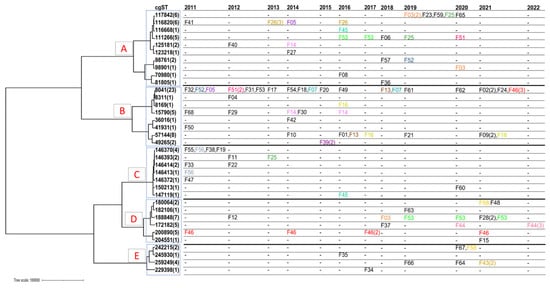 A total of 109 S. Dublin isolates collected from 2011 to 2022 were obtained from necropsy cases and diagnostic samples submitted to the Penn State Animal Diagnostic Lab. These samples came from 109 cattle on 68 farms, including 17 dairy and 51 veal farms, spanning 22 counties in Pennsylvania. All isolates belonged to sequence type (ST) ST10 of the Salmonella MLST scheme and were classified into 35 core genome sequence types (cgSTs). Twelve cgSTs (96871, 111266, 116820, 117842, 8041, 15790, 57144, 146370, 146393, 172182, 188848, 259249) were found in both veal and dairy cattle, accounting for 71% of isolates. In comparison, 20 cgSTs were observed only in veal calves, while 3 cgSTs (204551, 200890, 150213) were observed in only dairy cattle (Supplementary Table S2). The 35 cgSTs were placed in five phylo-clusters (A–E) based on the allelic distances between cgSTs. These five clusters were analyzed for time (year) and source (farm) (Figure 1).