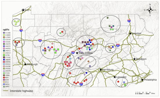 Geolocation of sources of S. Dublin isolates in Pennsylvania from 2011 to 2022. The shape–color label combination represents cgSTs of 81 isolates for which geographic information was available. The Disperse Markers tool of ArcGIS Pro was used to display points that are too close to one another. The gray circles show identified geo-clusters.