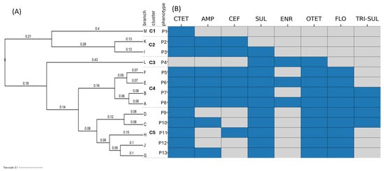 Phylogenetic clustering of S. Dublin isolates based on antimicrobial resistance (AMR) phenotypic profiles from veal and dairy cattle in Pennsylvania (2011–2022). (A) The dendrogram represents hierarchical clustering of isolates, with branch lengths indicating the genetic distance calculated based on the binary presence (1) or absence (0) of resistance genes. (B) The heatmap displays corresponding phenotypic resistance patterns (P1–P13), where blue cells indicate resistance to specific antimicrobial classes. AMP (ampicillin), ceftiofur (CEF), chlortetracycline (CTET), enrofloxacin (ENR), florfenicol (FLO), oxytetracycline (OTET), sulfadimethoxine (SUL), and trimethoprim/sulfamethoxazole (TRI-SUL).