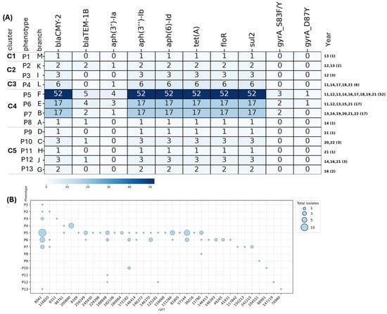The fourth cluster comprised four branches (A, B, E, and F) and exhibited four different phenotypes (P5-P8). This was the most significant cluster, comprising 87 of 109 isolates (80%), with a core antimicrobial resistance profile consisting of resistance to ampicillin, ceftiofur, chlortetracycline, florfenicol, oxytetracycline, and sulfamethazine, with additional resistance to enrofloxacin (branches A and E) and trimethoprim-sulfamethoxazole (branches A and B) (Figure 3A and Figure 4A). The isolates in this cluster belonged to six resistance genotypes, with the core genotype comprising blaCMY-2, aph(3′′)-Ib, aph(6)-Id, tet(A), floR, and sul2, also observed in isolates from cluster 2 (Figure 4B).