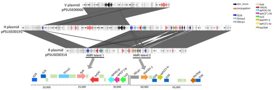 A linear representation of the plasmids observed in this study. The V plasmid pPSUSE00060 is a virulence plasmid that harbors the spv operon. The R plasmid pPSUSE00314 is a resistance plasmid that carries two distinct islands (AMR island 1 and AMR island 2). The two islands are located in a region of the plasmid that is flanked by two IS26 elements. The H plasmid pPSUSE00191 is a hybrid plasmid that includes elements from V and R plasmids.