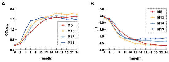 The growth curves of the four isolates are presented in Figure 2. Strain M5 grew slowly during the first 2 h, entered the logarithmic stage between 2 and 12 h, achieved the fastest growth rate, and plateaued after 12 h. Strains M13 and M15 entered the logarithmic stage between 2 and 8 h, reaching their fastest growth rates, and plateaued after 16 h and 8 h, respectively. Strain M19 grew fastest between 4 and 6 h, entering the logarithmic phase, and plateaued after 6 h with a slower growth rate. The pH of strains M5 and M13 decreased to below 4.5 after 24 h of growth, while the pH of strains M15 and M19 decreased to below 5 during the same period.