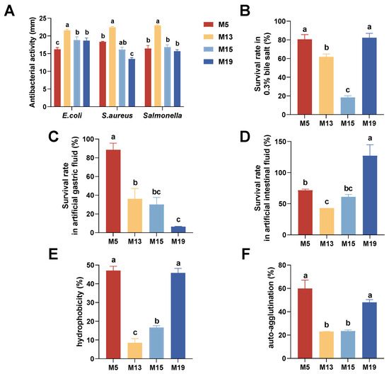 The auto-agglutination results are presented in Figure 3F. L. johnsonii M5 had the highest rate (59.9%), followed by Lactobacillus reuteri M19 (48.13%). Loigolactobacillus coryniformis M15 and Lactobacillus agilis M13 had rates of 23.42% and 22.94%, respectively.