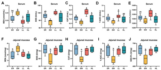 As shown in Figure 5A, the serum MDA content was significantly lower in the LL group compared to the HL group and significantly lower in the HL group than in the EW group (p < 0.05). The SOD and CAT levels were significantly higher in the LL group than in the HL group and significantly higher in the HL group than in the EW group (Figure 5B,C; p < 0.05). Compared with the EW group, T-AOC and GSH-Px levels were significantly higher in the LL group (Figure 5D,E; p < 0.05).