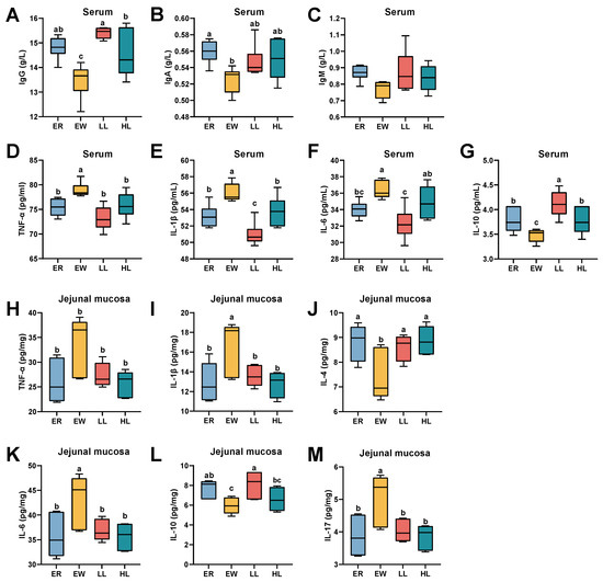 As shown in Figure 6A, IgG levels in serum were significantly higher in the LL, ER and HL groups than in the EW group (p < 0.05). IgG levels were significantly higher in the LL group than in the HL group (p < 0.05). And there was no significant difference between the IgG levels in the ER group and those in both the LL and HL groups (p > 0.05). However, IgA and IgM levels in the LL and HL groups did not differ significantly from those in the EW group (Figure 6B,C; p > 0.05). Serum IgA levels were significantly higher in the ER group than in the EW group (Figure 6B; p < 0.05). As shown in Figure 6D,E, pro-inflammatory cytokines TNF-α and IL-1β were significantly lower in the ER, LL, and HL groups compared to the ER group (p < 0.05). In addition, the serum levels of IL-1β in the LL group were significantly lower than those in the ER and HL groups (Figure 6E; p < 0.05). As shown in Figure 6F, serum IL-6 levels were significantly lower in the ER and LL groups than in the EW group (p < 0.05), and IL-6 levels were significantly lower in the LL group than in the HL group (p < 0.05), and there were no significant differences between the HL group and either the ER or EW groups (p > 0.05). The anti-inflammatory cytokine IL-10 level was significantly higher in the LL, HL, and ER groups compared to the EW group, with IL-10 in the LL group significantly exceeding levels in the ER and HL groups (Figure 6G; p < 0.05).