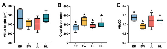 As shown in Figure 6A, there was no significant difference in villus height between the four groups (p > 0.05). Crypt depth was significantly lower in the ER and LL groups than in the EW group (Figure 7B; p < 0.05). VH:CD was significant higher in the ER, LL, and HL groups than the EW group (Figure 7C; p < 0.05).
