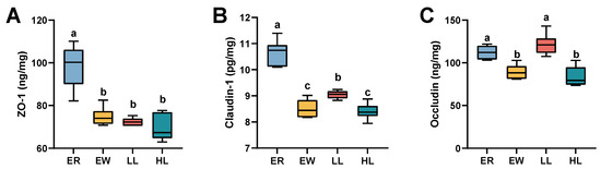 As shown in Figure 8A, ZO-1 content in the jejunal mucosa of the EW, LL, and HL groups was significantly lower than that of the ER group (p < 0.05). As shown in Figure 8B, the levels of claudin-1 in the jejunal mucosa were significantly lower in the EW, LL, and HL groups than in the ER group (p < 0.05), and the levels of claudin-1 were significantly lower in the EW and HL groups than in the LL group (p < 0.05). The occludin content in the jejunal mucosa was significantly higher in the ER and LL groups than in the EW and HL groups (Figure 8C; p < 0.05).