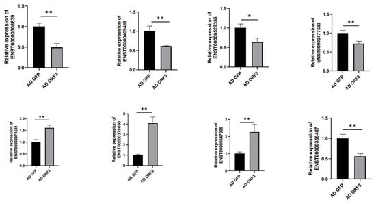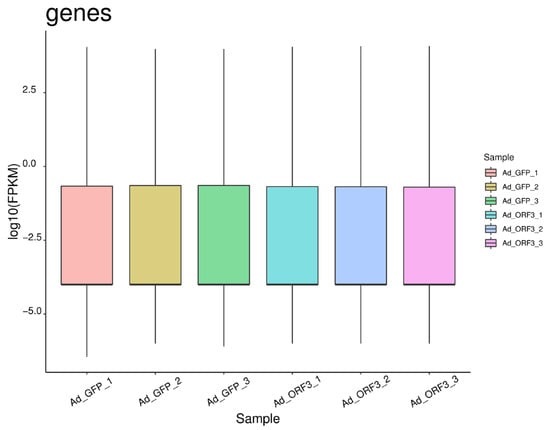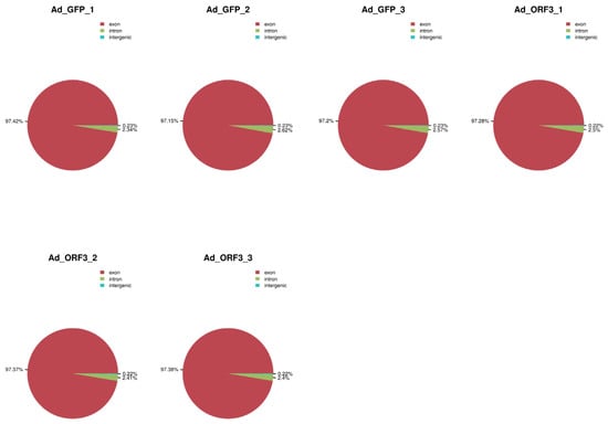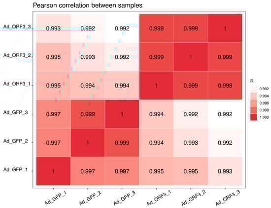 RNA samples Ad_ORF3_3, Ad_ORF3_2, Ad_ORF3_1, Ad_GFP_3, Ad_GFP_2, and Ad_GFP_1 underwent transcriptome sequencing (LC-Bio Technology CO., Ltd., Hangzhou, China) [].