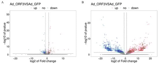 Volcano plots of differentially expressed genes (A) and transcripts (B) in Ad-ORF3 and Ad-GFP samples. The abscissa represents the differential expression fold of the gene in different samples. The ordinate represents the statistical significance of the difference in gene expression levels. Red represents up-regulated significantly differentially expressed genes, blue represents down-regulated significantly differentially expressed genes, and gray represents non-significantly differentially expressed genes.