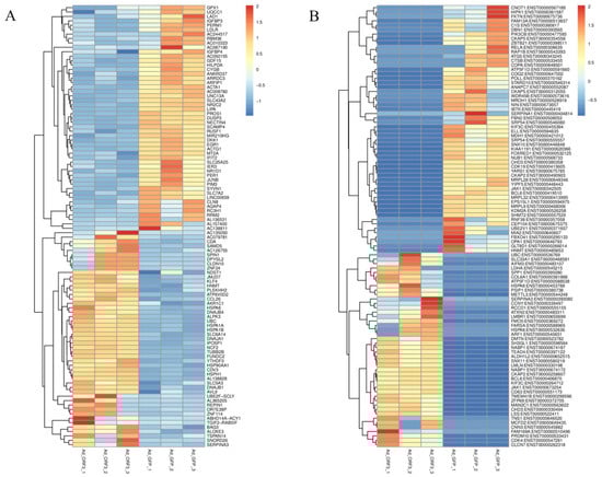 Heat maps of differentially expressed genes (A) and transcripts (B). The abscissa represents the sample, the ordinate is the differential gene or transcript, the different colors in the figure represent the different levels of gene expression, the color from blue to white to red represents the expression level from low to high, red represents highly expressed genes, and blue represents low-expression genes.