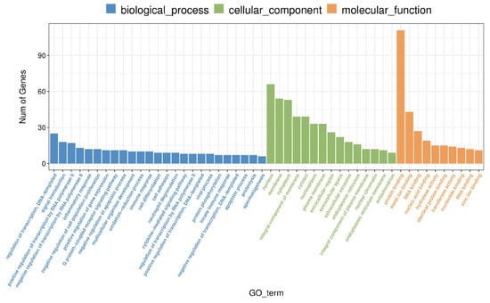 Histogram of GO enrichment pathway of differential genes. The GO enrichment classification histogram reflects the distribution of the number of distinct genes on the enrichment entries in biological processes, cellular components, and molecular processes, and due to the large number of enriched GO terms, it is impossible to put all the results in one graph, so the top 25, top 15, and top 5 of BP, CC, and MF are displayed respectively for plotting, where the abscissa represents GO terms and the ordinate represents the number of genes.