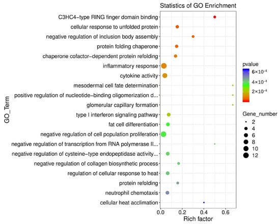 The GO analysis showed that the GO terms of differentially expressed mRNA were as follows: significantly enriched C3HC4−type RING finger domain binding (GO:0055131), cellular response to unfolded protein (GO:0034620), negative regulation of inclusion body assembly (GO:0090084), protein folding chaperone (GO:0044183), chaperone cofactor-dependent protein refolding (GO:0051085), inflammatory response (GO:0006954), cytokine activity (GO:0005125), mesodermal cell fate determination (GO:0007500), positive regulation of nucleotide-binding oligomerization domain containing 2 signaling pathways (GO:0070434), glomerular capillary formation (GO:0072104), type I interferon signaling pathway (GO:0060337), fat cell differentiation (GO:0045444), negative regulation of cell population proliferation (GO:0008285), negative regulation of collagen biosynthetic process (GO:0032966), regulation of cellular response to heat (GO:1900034), protein refolding (GO:0042026), neutrophil chemotaxis (GO:0030593), cellular heat acclimation (GO:0070370), negative regulation of transcription by RNA polymerase II (GO:0000122), and negative regulation of cysteine-type endopeptidase activity involved in apoptotic process (GO:0043154) (Figure 8).