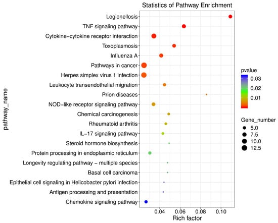 The KEGG analysis showed that the pathways of the following differentially expressed mRNAs were significantly enriched: Legionellosis (ko05134), TNF signaling pathway (ko04668), cytokine−cytokine receptor interaction (ko04060), toxoplasmosis (ko05145), influenza A (ko05164), pathways in cancer (ko05200), herpes simplex virus 1 infection (ko05168), leukocyte transendothelial migration (ko04670), prion diseases (ko05020), NOD-like receptor signaling pathway (ko04621), chemical carcinogenesis (ko05204), rheumatoid arthritis (ko05323), IL-17 signaling pathway (ko04657), steroid hormone biosynthesis (ko00140), protein processing in endoplasmic reticulum (ko04141), longevity regulating pathway-multiple species (ko04213), basal cell carcinoma (ko05217), epithelial cell signaling in Helicobacter pylori infection (ko05120), antigen processing and presentation (ko04612) and chemokine signaling pathway (ko04062) (Figure 9).