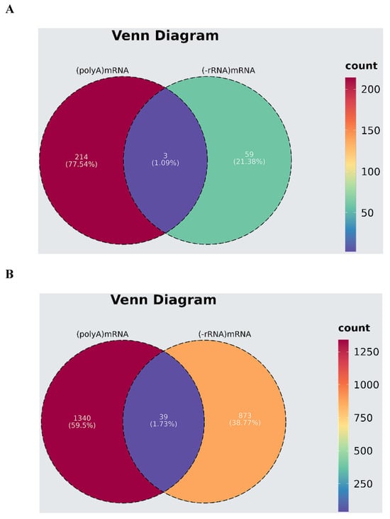 Comparing transcriptome and mRNA expression profiles of lncRNA sequencing results through Venn analysis. (A) Venn analysis for 217 significantly differentially expressed mRNAs from transcriptomics and 62 mRNAs from lncRNA sequencing results. (B) Venn analysis for 1635 significantly differentially expressed transcripts from transcriptome sequencing and 6564 transcripts of mRNAs from lncRNA sequencing.