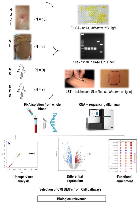 Diagram summarizing the sampling, diagnostic methods (ELISA—Enzyme Linked ImmunoSorbent Assay, PCR—Polymerase Chain Reaction, LST—Leishmanin Skin Test) and transcriptome analysis by RNA-sequencing of non-ulcerated cutaneous leishmaniasis (NUCL), visceral leishmaniasis (VL) patients, asymptomatic (AS) from Amapala, Honduras and non-infected (NEG) individuals from São Paulo, Brazil. Identification of cell-mediated immunity (CMI) differentially expressed genes (DEGs) associated with different clinical outcomes. N: Number of cases studied per group.