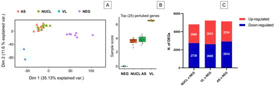To characterize differences between leishmania infection manifestations and controls, an unsupervised principal component analysis (PCA) was performed using the global expression data of all genes from the RNAseq. The PCA revealed three clusters: a first cluster including NUCL and AS, a second of NEG, and a third one of VL individuals (Figure 2A). Importantly, NUCL patient samples clustered closely with asymptomatic (AS) L. (L.) infantum chagasi infections. To determine the molecular perturbation caused by the L. (L.) infantum chagasi infection in NUCL, AS, and VL cases relative to NEG cases, we submitted the normalized gene expression to the Molecular Degree of Perturbation (MDP) webtool []. The degree of perturbation of the top 25% perturbed genes was comparable in NUCL and AS and but far higher in VL individuals (Figure 2B). Hence, both PCA and MDP showed that overall gene expression between the groups NUCL and AS were similar. To determine which genes had altered expression in AS, NUCL and VL cases, we identified the differentially expressed genes for each infected group relative to the negative controls (NEG), using a threshold of 2-fold change for differently expressed genes (DEGs), with an adjusted p-value < 0.05 (FDR) from Benjamini–Hochberg correction. This included 4806 DEGs between NUCL and NEG (2068 up-regulated and 2738 down-regulated), 5238 between VL and NEG (2633 up-regulated and 2605 down-regulated), and 5148 between AS and NEG (2234 up-regulated and 2914 down-regulated) (Figure 2C). The numbers of differentially expressed genes were similar among the comparisons (Figure 2C).