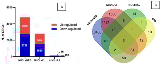 Identification of gene signature of cell-mediated immunity in NUCL cases by counting CMI DEGs in the NUCL vs. AS. (A) The number of DEGs counting for the datasets NUCL vs. NEG, NUCL vs. VL, NUCL vs. AS confirms the wide similarity between the groups NUCL and AS. (B) Venn diagram shows the identification of 8 CMI DEGs of NUCL vs. AS (green balloon), 2 in intersection with NUCL vs. NEG, 3 in intersection with NUCL vs. NEG and NUCL vs. VL, 2 in intersection with NUCL vs. VL, and only one DEG exclusive of NUCL vs. AS. This 8 DEGs were identified as transcriptomic signature of cell-mediated immunity in NUCL (Table 1).