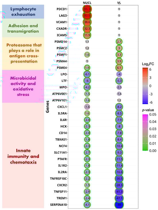 Comparatively, the greatest differences between NUCL and VL were observed in the expression of innate immunity biomarkers (49 for innate immunity, 24 for Th2, 20 for Th1, 15 for Th17, 14 for Treg, 14 for lymphocyte exhaustion, and 7 for CTL) (Figure S4 and Table S2). Most of the genes with higher expression in NUCL have a central role in activating the pro-inflammatory response and inflammation (TREM1, IL1RAP, NLRP3, CD14, NOD2, MEFV, LYN). In contrast, genes with higher expression in VL are related to the complement system, inflammation and response to viruses (C1QA, C1QB, HSP90AA1, TRIM10).