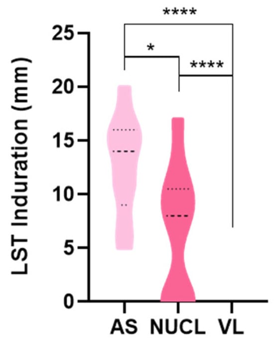 Comparison of induration of Leishmanin skin test (LST) lesion among asymptomatic (AS), non-ulcerated cutaneous leishmaniasis (NUCL) and visceral leishmaniasis (VL) individuals upon 72 h of intradermal injection of L. infantum chagasi antigen. Parametric test-t student and non-parametric Mann–Whitney. (*) p-value < 0.05, (****) p-value < 0.0001.