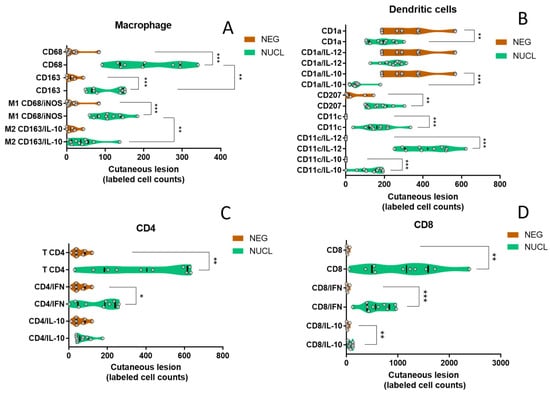 Comparison of the expression of antigen-presenting cells markers in cutaneous lesion between NUCL and NEG individuals. (A) The violin plots showing all points present comparison of in situ cutaneous counts of monocytes/macrophages (CD68 and CD163), macrophage cells M1 (CD68/iNOS) and M2 (CD163/IL-10). (B) Epidermal (CD1a), Langerhans (CD207), dermal (CD1c) dendritic cells, pro-inflammatory epidermal (CD1a/IL-12), suppressor epidermal (CD1a/IL-10), pro-inflammatory dermal (CD11c/IL-12), suppressor dermal (CD11c/IL-10). (C) pro-inflammatory CD4+ T lymphocytes (CD4/IFN-γ), suppressor T lymphocyte (CD4/IL-10). (D) pro-inflammatory CD8+ T helper lymphocytes (CD8/IFN-γ), suppressor T helper lymphocyte (CD8/IL-10) in in situ cutaneous lesion in NUCL (green) and healthy skin of NEG (brown) individuals by conventional and doble-staining immunohistochemistry (IHC). Parametric test-t student and non-parametric Mann–Whitney. (*) p-value < 0.05, (**) p-value < 0.01, (***) p-value < 0.001.