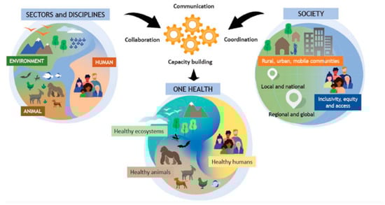 The One Health concept as developed by the One Health High-Level Expert Panel (OHHLEP), illustrating the interconnectedness of the environment, animals, humans, and society. Communication, collaboration, and coordination among different scientific disciplines are essential to support healthy ecosystems, humans, and animals. Available under the Creative Commons CC0 1.0 license [].