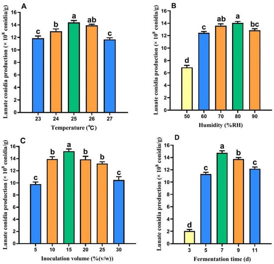 Effects of different SSF conditions on lunate conidia production by Fxy121. (A) The effect of fermentation temperature on the yield of lunate conidia of Fxy121. (B) The effect of fermentation humidity on the yield of lunate conidia of Fxy121. (C) The effect of Inoculation volume on the yield of lunate conidia of Fxy121. (D) The effect of fermentation time on the yield of lunate conidia of Fxy121. The lowercase letters indicate significant differences at the p < 0.05 level according to the LSD test.
