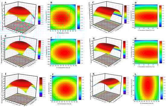 Response surface and contour plot for the SSF of Fxy121. (A,B) Response surface and contour plots of the effects of temperature and humidity on the yield of Fxy121 lunate conidia; (C,D) response surface and contour plots of the effects of temperature and inoculation volume on the yield of Fxy121 lunate conidia; (E,F) response surface and contour plots of the effects of temperature and fermentation time on the yield of Fxy121 lunate conidia; (G,H) response surface and contour plots of the effects of humidity and inoculation volume on the yield of Fxy121 lunate conidia; (I,J) response surface and contour plots of the effects of humidity and fermentation time on the yield of Fxy121 lunate conidia; (K,L) response surface and contour plots of the effects of inoculation volume and fermentation time on the yield of Fxy121 lunate conidia.