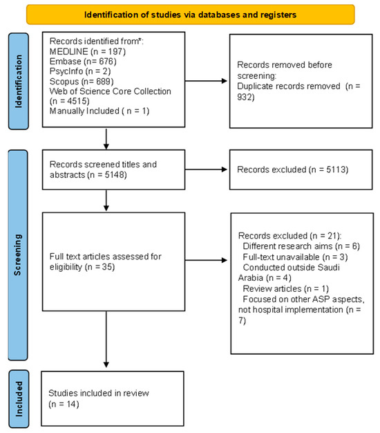 The initial database search retrieved 6080 titles and abstracts, and an additional paper was identified after reviewing the references and existing reviews. After further assessment, 5148 titles and abstracts were evaluated, and 35 studies were eligible for full-text review. A further 21 studies were excluded for the following reasons: different research aims (n = 6), full-text unavailable (n = 3), conducted outside Saudi Arabia (n = 4), review articles (n = 1), and focus on other antimicrobial stewardship aspects than hospital implementation (n = 7). One additional research paper was found through this manual search process and was included in the systematic review. Ultimately, 14 studies met the criteria for inclusion in the analysis. The study selection process is summarized in the flow diagram shown in Figure 1.