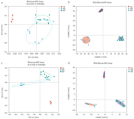 Comparison of soil microbial communities in rhizospheres between MT and MS melon varieties. (a) PCoA of rhizosphere bacterial communities at the OTU level. (b) PLS-DA score plot of rhizosphere bacterial communities. (c) PCoA of rhizosphere fungal communities at the OTU level. (d) PLS-DA score plot of rhizosphere fungal communities.