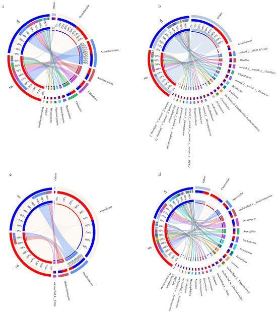Distributions of rhizosphere bacteria (a,b) and fungi (c,d) between MT and MS varieties at the phylum and genus levels.