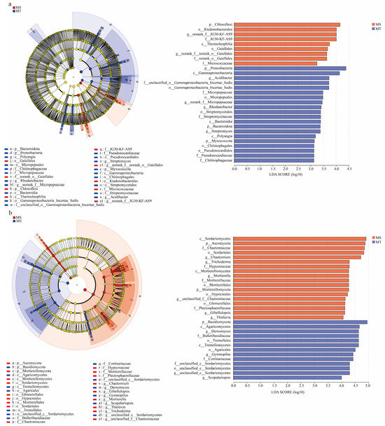 LEfSE analysis of soil bacteria (a) and fungi (b) in rhizospheres between MT and MS varieties.