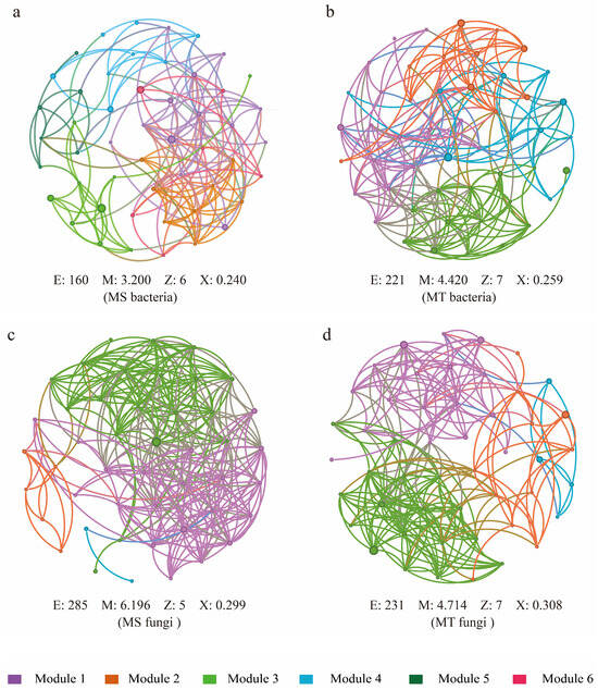 Co-generation network of the bacteria of MS (a) and MT (b); co-generation network of the fungi of MS (c) and MT (d); each node represents a single genus, and different colors represent different modules. E, M, Z, and X represent the number of edges, average degree, network diameter, and average clustering coefficient, respectively.