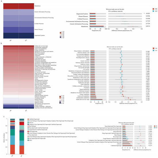 Additionally, as shown in Figure 6c, 12 functional categories of soil fungal communities, such as Animal Pathogen-Dung Saprotroph-Endophyte-Epiphyte-Plant Saprotroph-Wood Saprotroph and Dung Saprotroph-Undefined Saprotroph in rhizospheres of MT, were significantly higher than those of MS. In contrast, Parasite-Undefined Saprotroph fungi were significantly lower in rhizospheres of MT than those of MS.