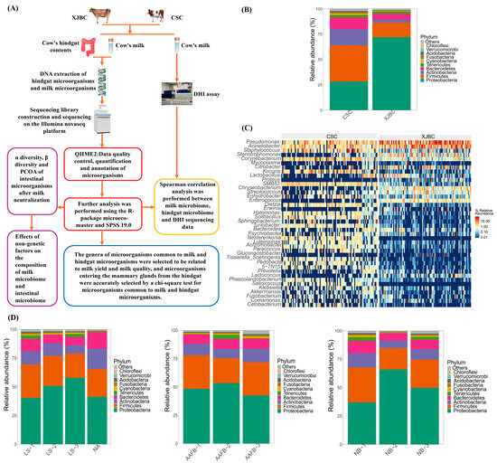 Differences in microbial and nongenetic factors in XJBC and CSC milk: (A) Workflow of this study. (B) Microbial diversity at the XJBC and CSC phylum levels. (C) Microbial diversity at the XJBC and CSC genus levels. (D) Effects of nongenetic factors on microbes in XJBC and CSC milk: LS: indicates different lactation stages; AAFB: indicates different first calving months of age; NB: indicates different litter sizes.