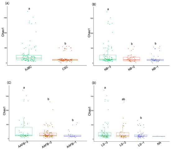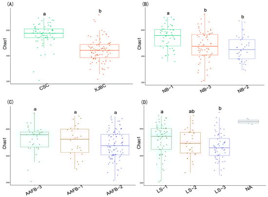 α Diversity estimates of microbial communities in the milk of dairy cows. (A–D), respectively: (A) indicates different breeds; (B) indicates different parity of cows; (C) indicates different first calving months of age; (D) indicates different stages of lactation. Different lowercase letters indicate significant differences (p < 0.05), and the same lowercase letters indicate nonsignificant differences (p > 0.05).