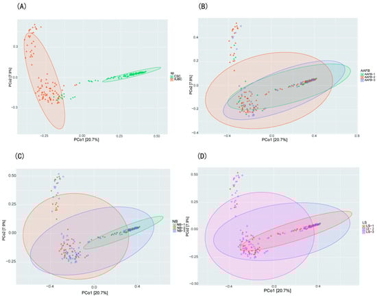 PCOA maps of milk microbes in dairy cows: (A) indicates XJBC versus CSC; (B) indicates different first calving months of age; (C) indicates different parities; (D) indicates different stages of lactation.