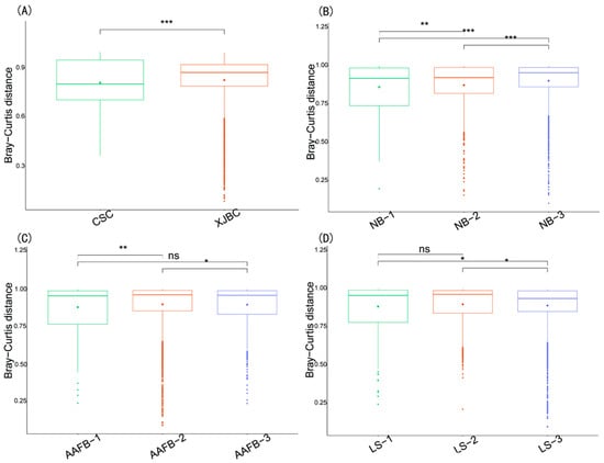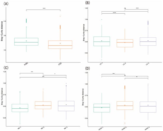 β Diversity estimation of microbial communities in the milk of dairy cows: (A) indicates different breeds; (B) indicates different parities; (C) indicates different first calving months of age; (D) indicates different stages of lactation. ns denotes not significant, “*” denotes significant, “**” denotes highly significant, and “***” denotes very significant.