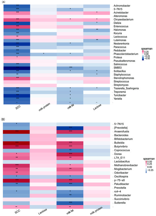 Correlation analysis of milk and hindgut microorganisms with milk fat, milk protein, lactose and somatic cell counts in dairy cows. (A) Milk microorganisms and (B) hindgut microorganisms. “*” denotes significant, ‘**’ denotes highly significant and ‘***’ denotes very significant.