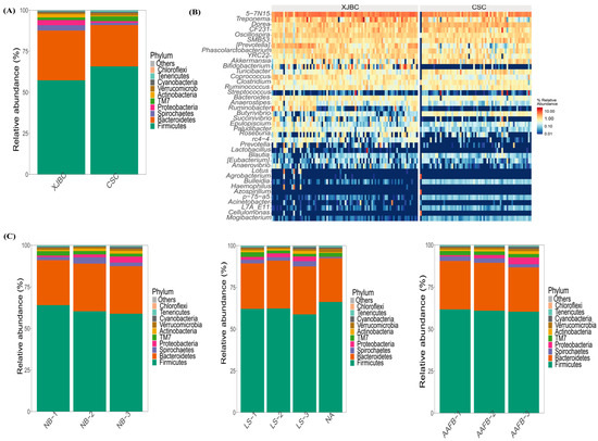 As shown in Figure 6, the composition of the top 10 species with the highest abundance values at the phylum level in each sample was visualized using relative abundance histograms. The hindgut samples from the two breeds (XJBC and CSC) differed significantly in their bacterial community structure. Across all the samples, five phyla with relative abundance values greater than 1% were identified: Firmicutes, Bacteroidetes, Spirochaetes, TM7, and Proteobacteria. Together, these phyla accounted for 85% of the total abundance.