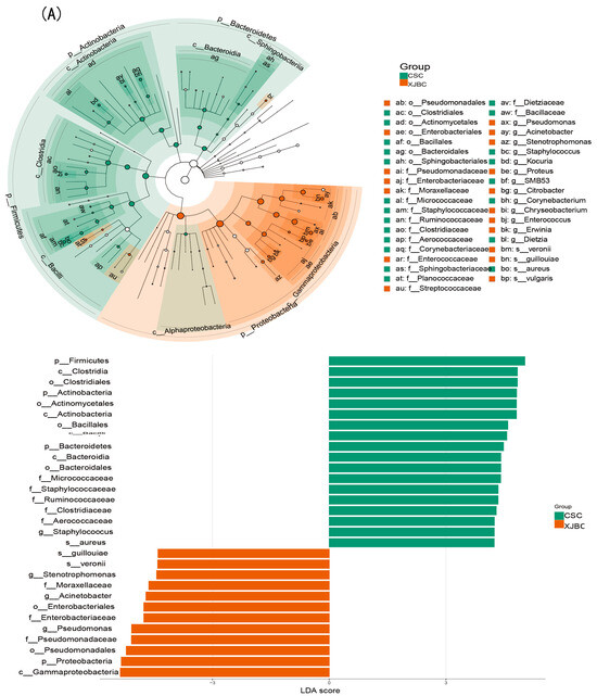 In this experiment, as shown in Figure 10, we applied linear discriminant analysis effect size to further explore the differences in microorganisms in the milk of XJBC and CSC. At the genus level, we found that microorganisms, such as Staphulococcus, Stenotrophomonas, Acinetobacter and Pseudomonas, in the XJBC milk samples were significantly enriched. At the individual level, the microorganisms significantly enriched in the XJBC milk samples included Pseudomonadaceae, Enterobacteriaceae, Moraxellaceae, Xanthomonadaceae, Enterococcaceae, and Streptococcaceae. The microorganisms significantly enriched in the CSC milk samples included Micrococcaceae, Staphylococcaceae, Ruminococcaceae, Clostridiaceae and Aerococcaceae. Microorganisms with relatively high abundances in the hindgut of CSC included p_Firmicutes, o_Clostridiales, c_Clostridia f_Ruminococcaceae, p_Proteobacteria, f_Lachnospiraceae, C_Bacteroidia, o_Bacteroidales, and p_Bacteroidetes. In LEfSe multilevel species-level analysis, the intestinal samples of Simmental cattle in China were significantly enriched with microorganisms such as Ruminococcaceae, Clostridiaceae, F16, Verrucomicrobiaceae, Akkermansia, Dorea and SMB53.